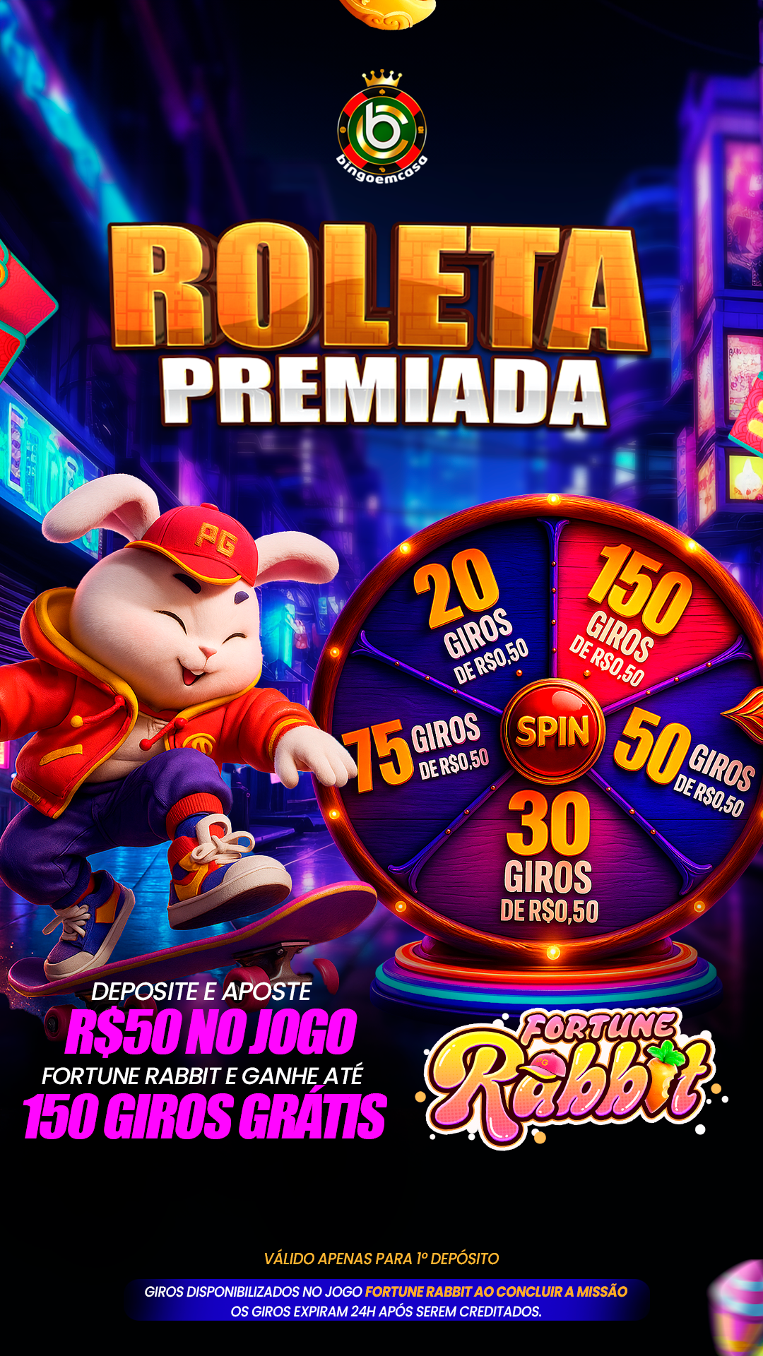 Ao realizar o seu primeiro depósito e apostar R$50 no jogo Fortune Rabbit, você desbloqueia a chance de ganhar até 150 giros grátis na Roleta Premiada.
